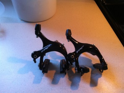 So I swept these up on the eBay for short money; $115 shipped. TRP 920 SL; lighter than the Dura-Aces and the SRAMs and whatnot, and I read they should perform more than adequately, and I could have spent three times this on something only marginally lighter. So I suppose I’ll keep both of them on, and descend in relative safety from hereon in.