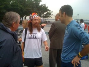 Nothing short of a surreal day today. This morning, Afton and I drove to lower Manhattan to meet up with Tellman Knudson, who embarked on his barefoot run across the country. If it sounds ridiculous, believe me – it is. And he’s absolutely the one to do it. I’ve known Tell for a long time now, and if there’s one thing that has never changed over the past – wow – forever that I’ve known him, it’s his energy. In all the years I’ve known him, run with him, raced in triathlons with him, worked and lived with him – he’s never been short on enthusiasm, drive, hell – I’ve never so much as seen him mope or even be depressed for that matter. We hadn’t met up in a number of years, so I guess I figured today, the start of this epic feat, in the presence of his epic feet, was as good as any.