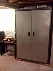 We picked up (barely) this Gladiator garage cabinet from Lowe’s. The idea was all hers, so I will take no credit. It is fantastic. We shopped everywhere for something like this, but this was the largest (48″ wide) and most useful, not to mention in stock. Amazingly, in packaging, the whole thing fits lengthwise in a Civic with the seats down. And not much sticking out of the trunk.