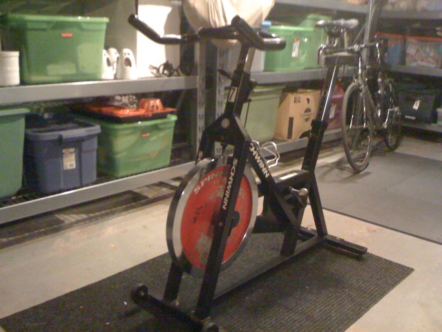 Got a crazy, crazy deal last night on a Schwinn Spinner. Found it on Craigslist; a guy was using it as a coat rack and wanted it gone. CHEAP. Happy to oblige. It was numbered ‘7’ from whatever gym it came from. The Lance karma is strong with this one.