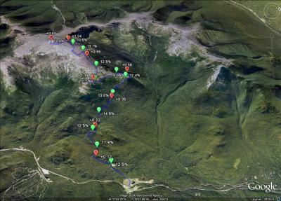 Here is how my mile splits stacked up against my 2008 PR. These splits are in red. The green markers represent the average grade of the auto road for the prior kilometer. These grade splits are taken directly from the race guide. The analysis is pretty straightforward – 2008 me was better every step of the way.