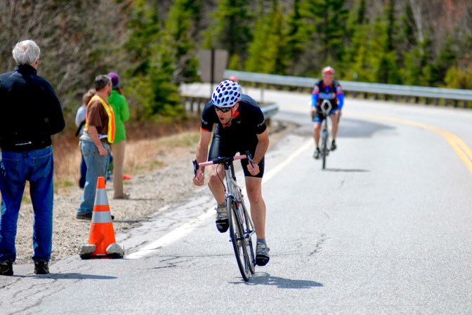 The rest of the week, I am totally spent.  Can’t even ride.  Thursday arrives and I’m doing community service work all day at a farm in Maine, building a roof.  The day started overcast and I thought little of the sun, but it cleared in the afternoon and by quitting time, I was absolutely cooked.  It was bad enough that I ran a fever that night, and was lying on the floor with chills until it was time for bed.  This was not really setting up well for a race on Saturday morning, where I would need to wake up at 5am and drive 2 hours north.