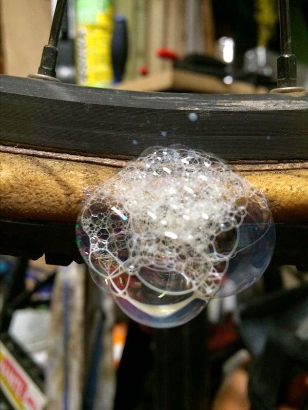 I revisited that rear wheel last night, hoping to cure its illness with some CaffeLatex, which has been very successful in the past. Unfortunately, this tire has much bigger issues. It seems in my half lap of airless exuberance, something bad happened in the neighborhood of the valve and inner tube, and the tire is toast.